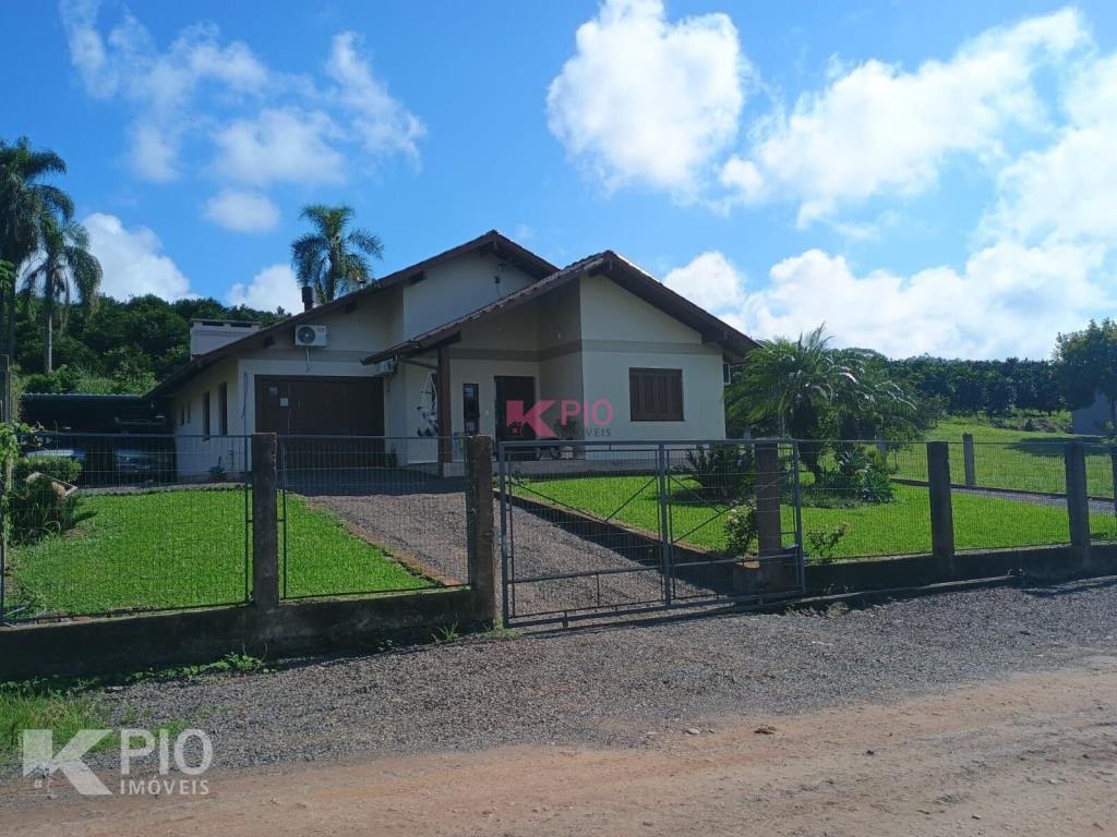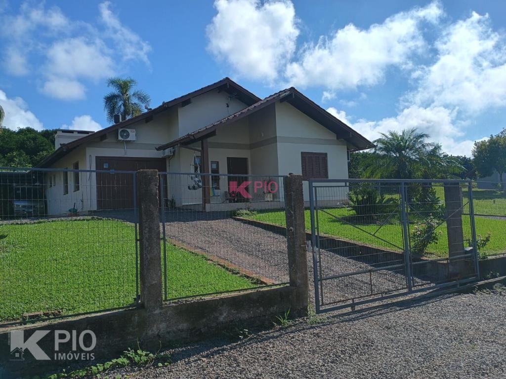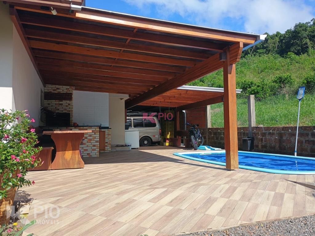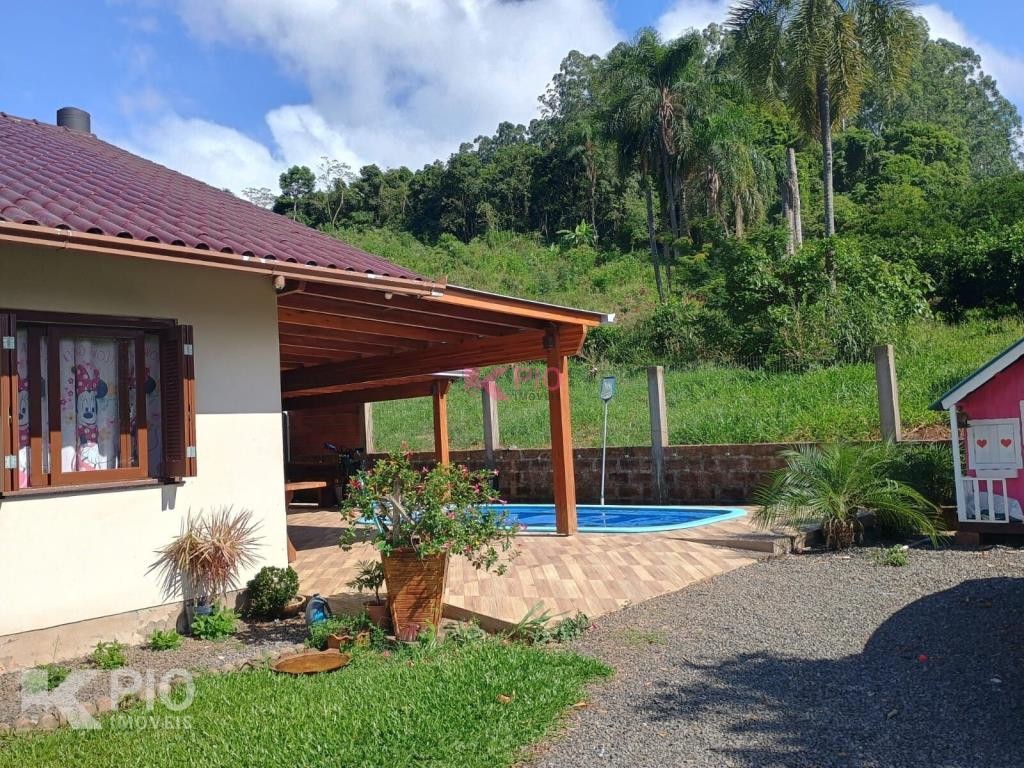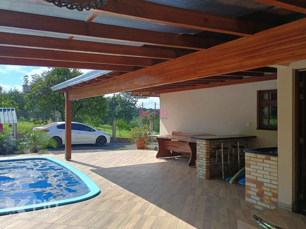 Casa no Morro da Saudade em Harmonia com 3 dormitórios, 2 banheiros, sala de tv, sala de jantar, cozinha, área de serviço e 3 garagens, 1 delas coberta. Também possui quiosque, piscina e churrasqueira.