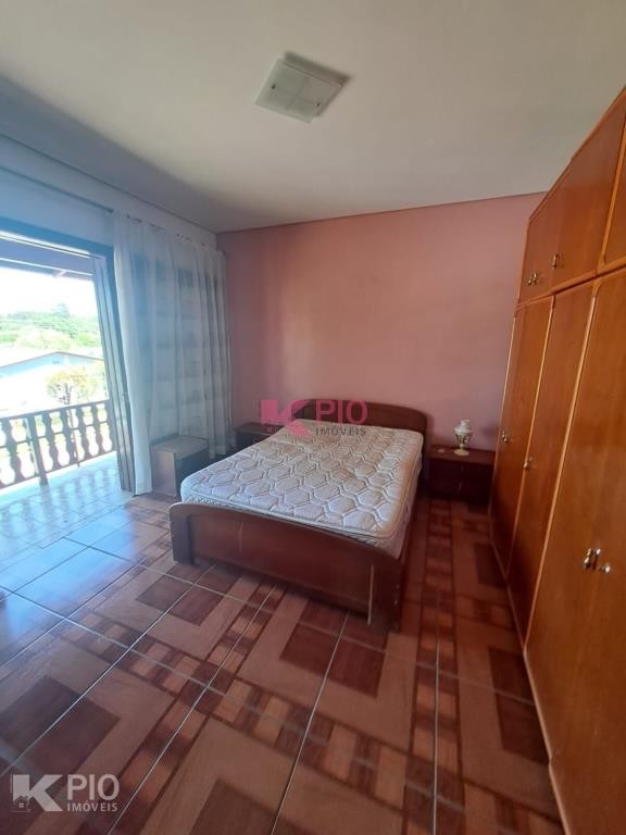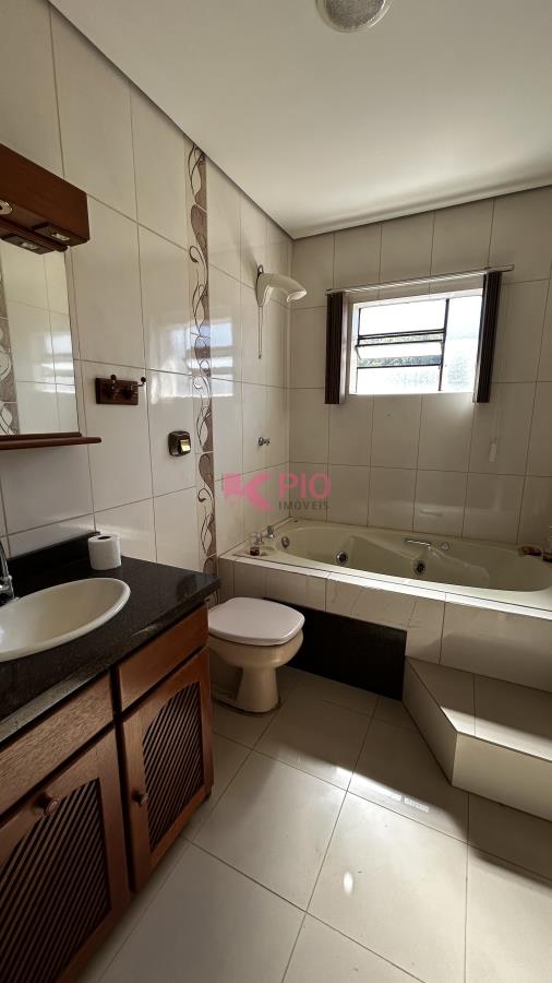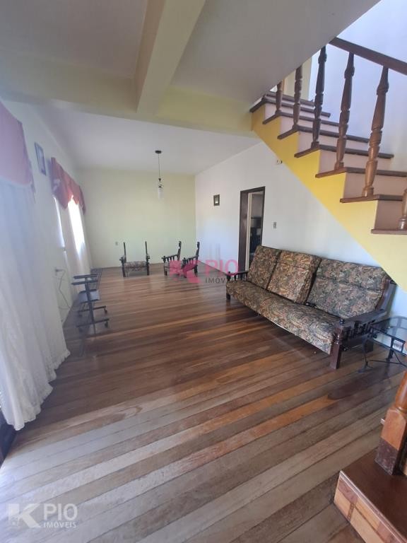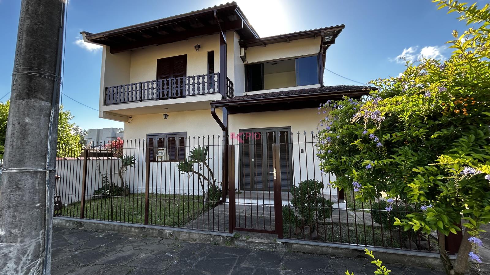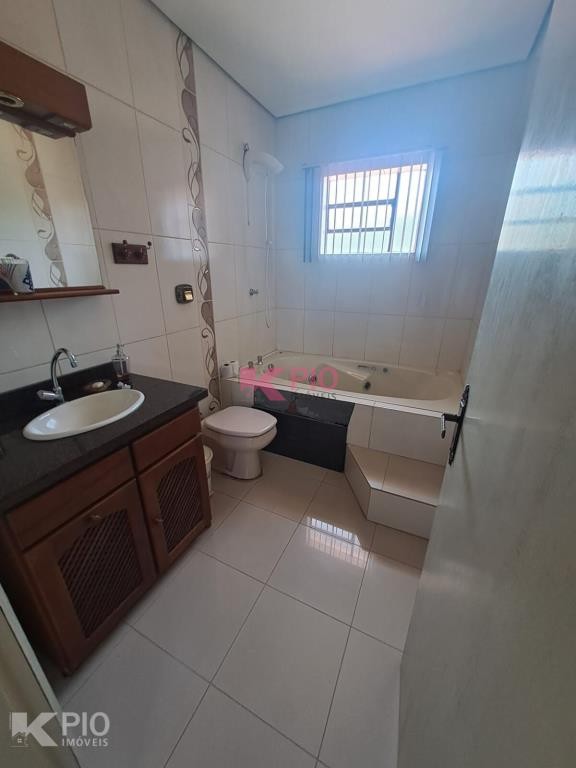 Casa de alvenaria com 3 dormitórios, 4 banheiros, sala de estar, sala de jantar, cozinha, área de serviço, escritório e garagem coberta.