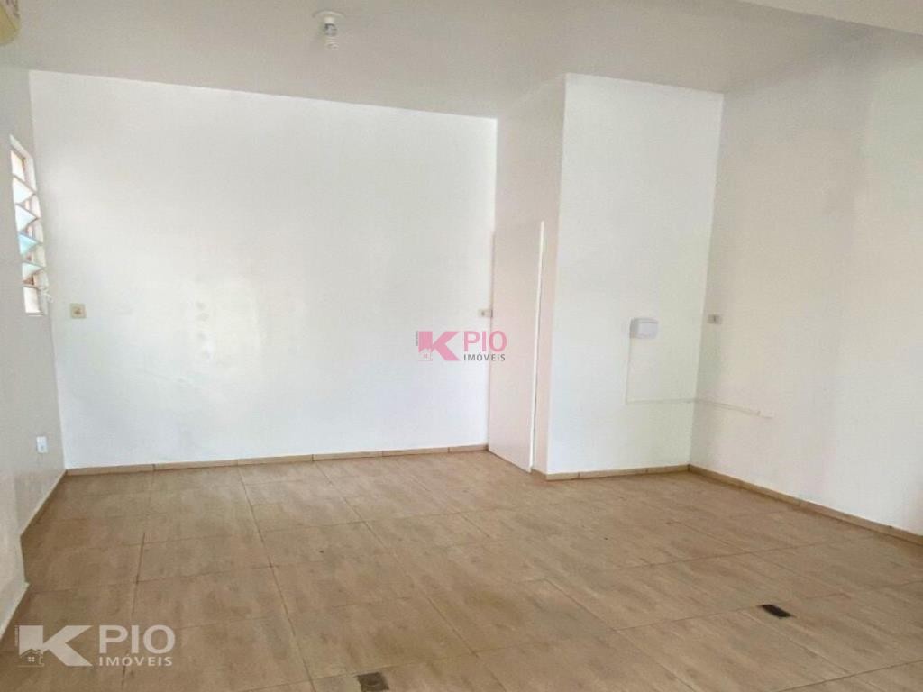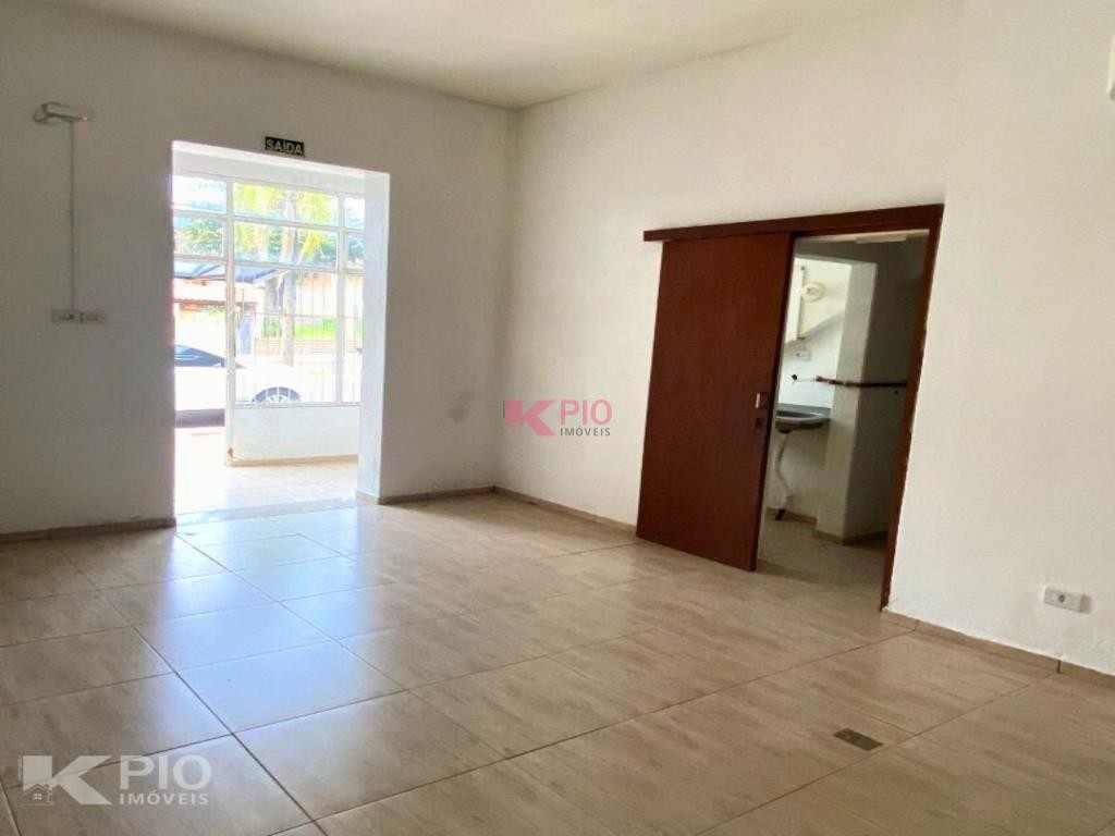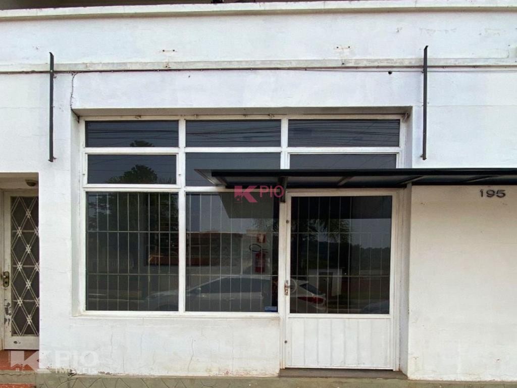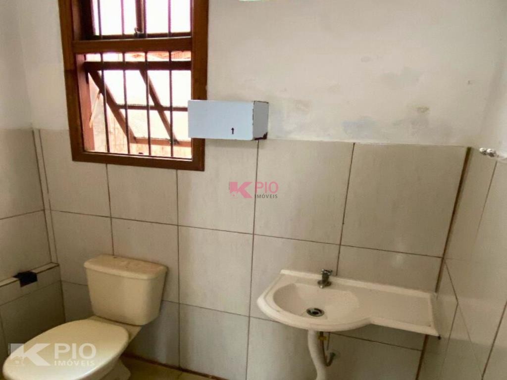 Sala comercial, com banheiro, cozinha, depósito e vitrine com grade.
